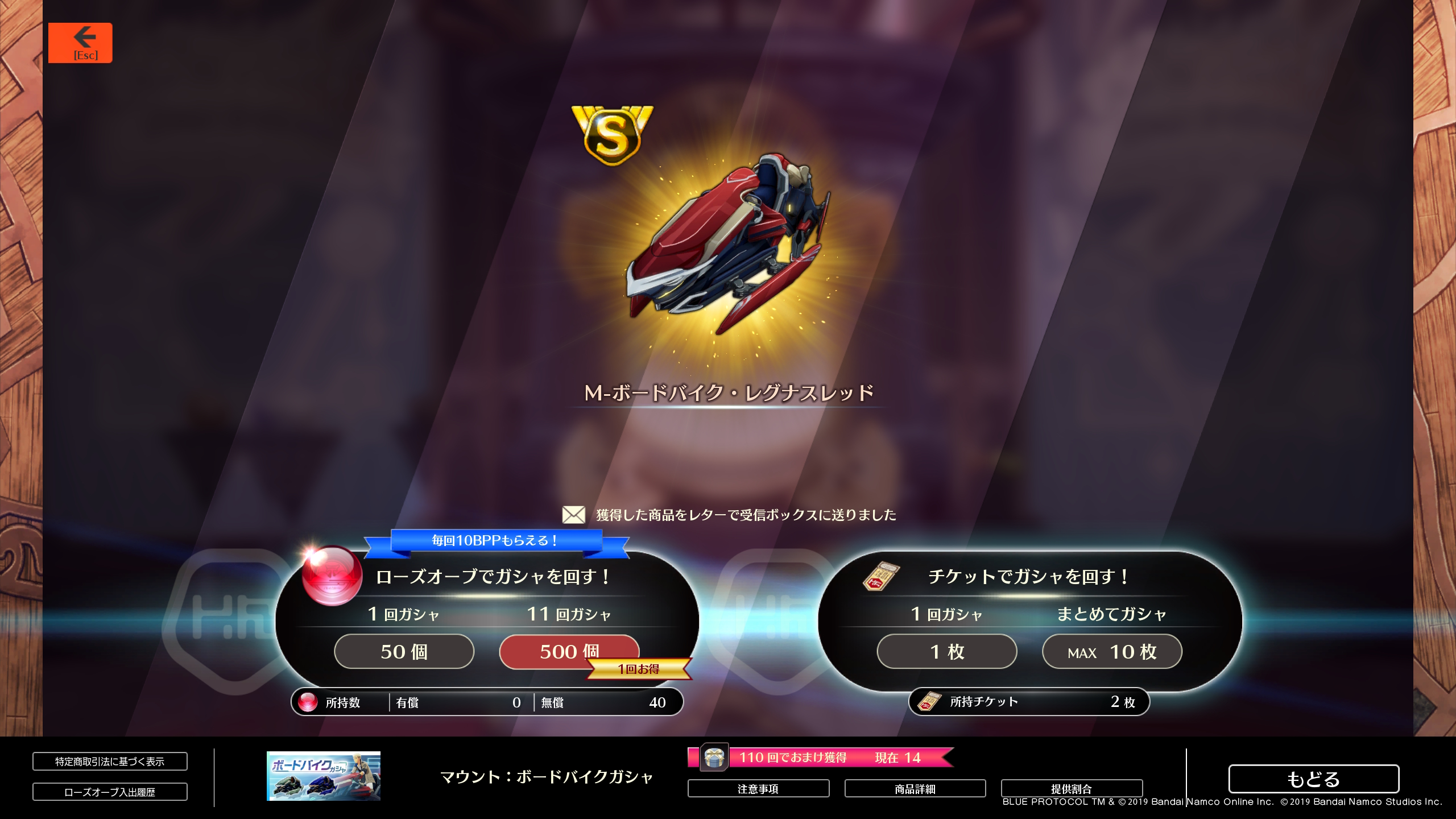 ブルプロの今回のマウントガシャはエアーバイク?ジェットバイク?、スターウォーズのアレみたいなやつで、ちょっと欲しかったんですけど、PCを新調して金欠だから完全に無料でやってるので、絶対ムリかぁと思っていました。
