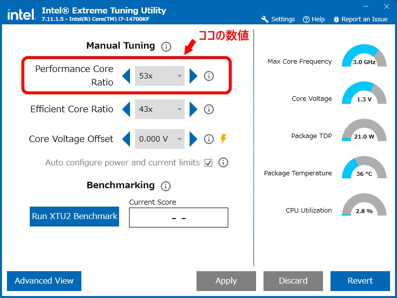 とにかくパフォーマンス・コアの値を下げて下さい。