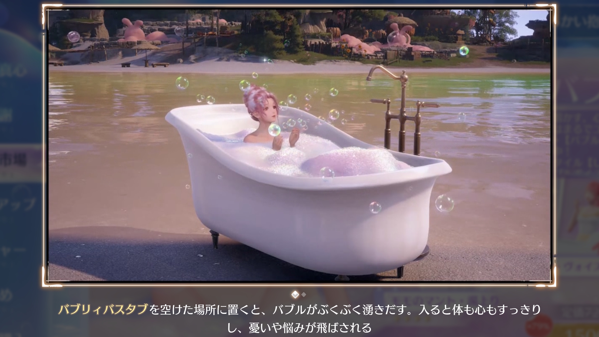 あと、今回のバージョンで販売中の設置型アイテムで「バブリィバスタブ」があるんですけど、なかなか攻めて来たなって印象がw