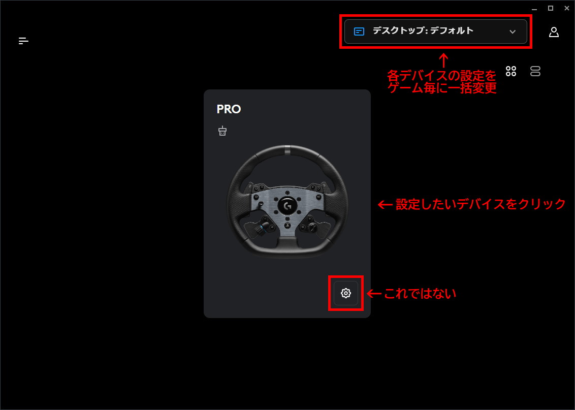 では、Logicool G HUBの画面を見つつ概要を説明していきます。