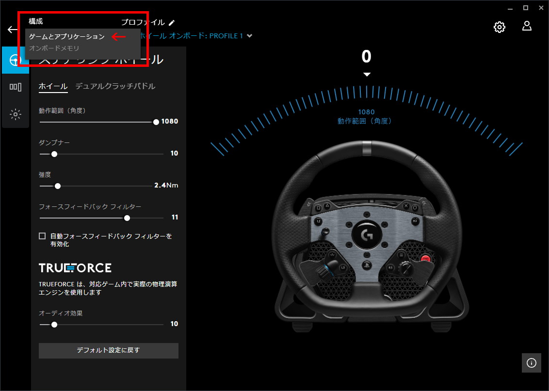まず「構成」の下にある「オンボードメモリ」となっているプルダウンを開いて、「オンボードメモリ」から「ゲームとアプリケーション」に切り替えます。