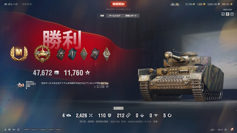 試合の結果は、2426ダメージ、アシスト212、4キルでMバッジでした。