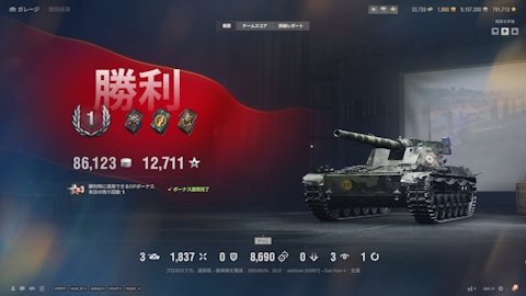 でも、おかげでTierⅩを抑えてチームトップの成績になれたし、これが自分にとって一番良い戦い方なのかも知れないし、これを続けていたらMバッジも遠くないと再認識しました。