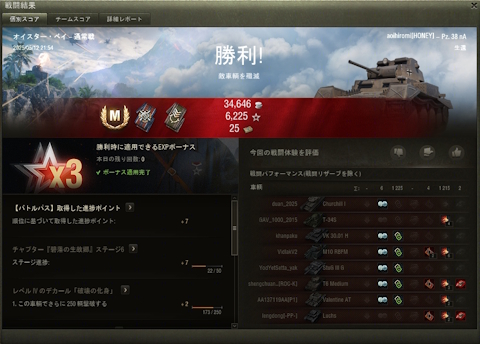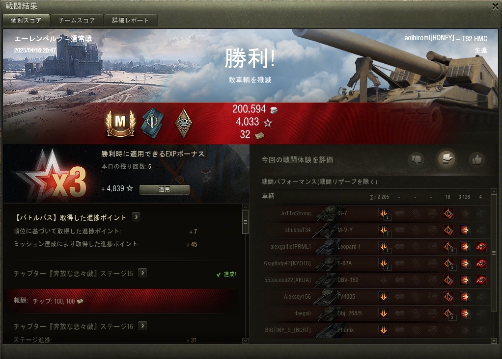 Tier 10ではグランドバトルもあるし、与ダメージについては3500とか、それ以上の時もあったのにMバッジが貰えなかったので、貰えるラインは相当高いんだろうなと思っていました。