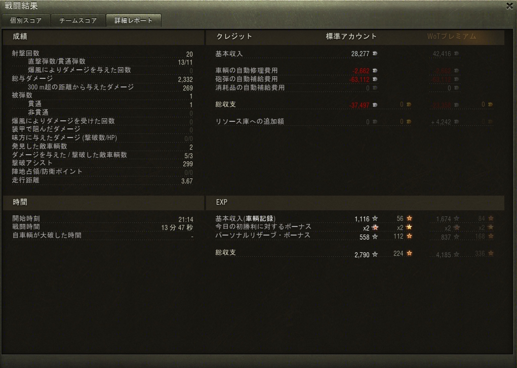隠蔽性が中戦車としては良くて、しかも命中精度も自動装填砲の中では良い上に、通常弾(APCR)で264mm、課金弾(HEAT)では330mmと貫通力が高く、与ダメージも390と4発入れば1500ダメージを超える性能を持っています。