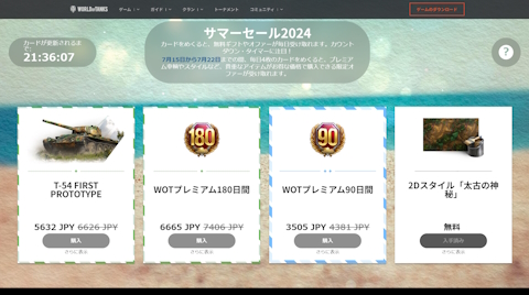 World of Tanksでサマーセール 2024と題して、7月15日から7月22日までの間、お得なセールを行っています。(ページを表示するにはログインが必要です)